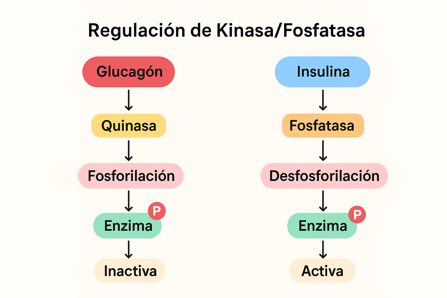 Regulación de Kinasa/Fosfatasa: El glucagón estimula la fosforilación de enzimas limitantes de la velocidad (añade un fosfato) a través de una quinasa. Son las enzimas más lentas o más reguladas de una vía metabólica —por ejemplo, la glucólisis o la gluconeogénesis— y determinan cuán rápido ocurre toda la vía. Por tanto, si activas o inhibes esa enzima, controlas la velocidad total del proceso.El glucagón se libera cuando baja la glucosa en sangre (ayuno).Su función es aumentar la producción de glucosa en el hígado.Lo hace activando una quinasa, es decir, una enzima que añade grupos fosfato a otras enzimas. Esa fosforilación cambia la forma y actividad de las enzimas metabólicas:Activa enzimas que favorecen la liberación de glucosa (gluconeogénesis, glucogenólisis). Inactiva enzimas que consumen glucosa (glucólisis, glucogénesis).Glucagón → activa quinasas → fosforila → estimula vías de obtención de glucosa. La insulina contrarresta esto al desfosforilar las enzimas (elimina el fosfato) a través de una fosfatasa.La insulina se libera cuando aumenta la glucosa en sangre (después de comer). Su función es favorecer el almacenamiento y uso de glucosa. Lo hace activando una fosfatasa, que elimina los grupos fosfato añadidos por las quinasas. Esto revierte los efectos del glucagón:Activa enzimas que usan o almacenan glucosa (glucólisis, glucogénesis). Inactiva las que liberan glucosa (gluconeogénesis, glucogenólisis). Insulina → activa fosfatasas → desfosforila → estimula vías de almacenamiento.