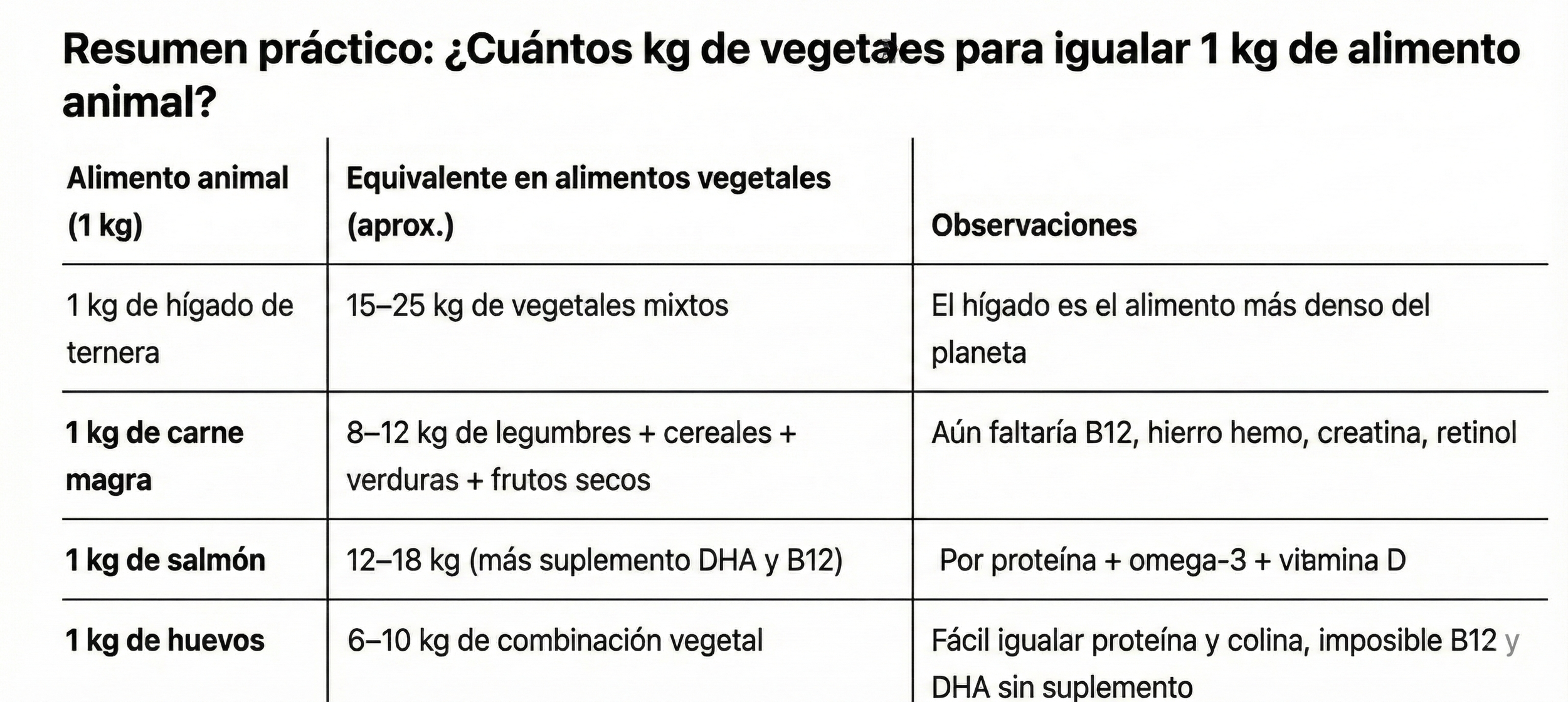 - Para igualar “todos” los nutrientes biodisponibles de 1 kg de carne magra o hígado, una persona necesitaría comer entre 8 y 25 kg de alimentos vegetales bien combinados al día (lentejas, quinoa, espinacas, brócoli, semillas, frutos secos, algas, etc.).